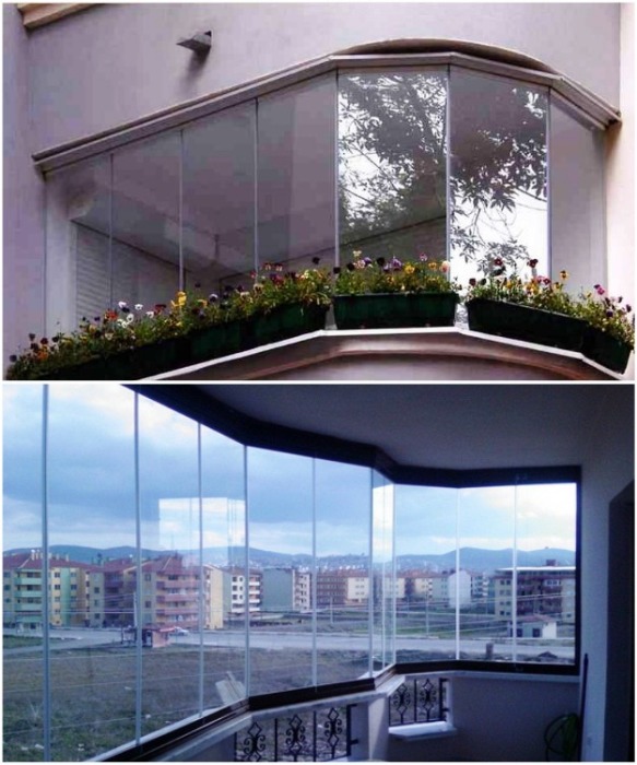 Несмотря на то, что безрамные конструкции позволяют сделать остекление балкона/лоджии любой формы, но при этом утеплить его не удастся. | Фото: remontkvartiri.su.
