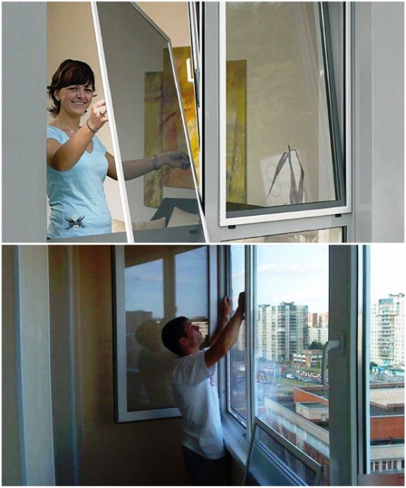 На все распашные окна лучше устанавливать москитные сетки. | Фото: lodgii-balkoni.my1.ru.