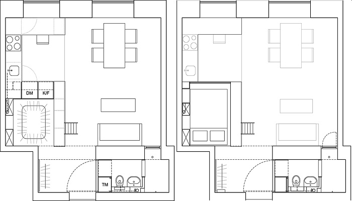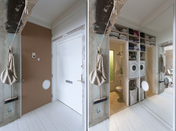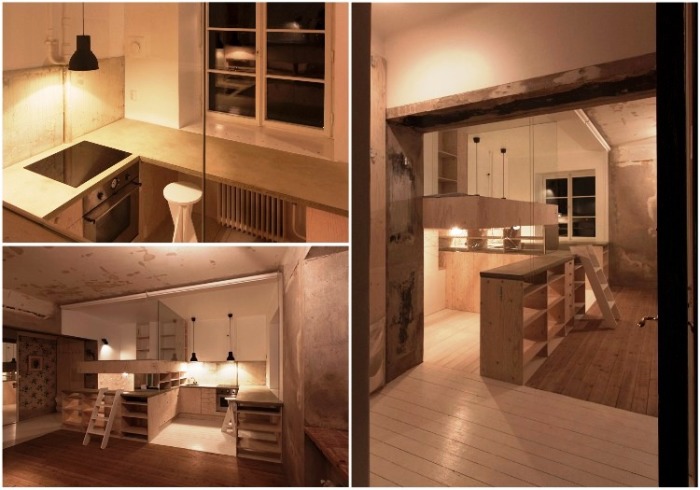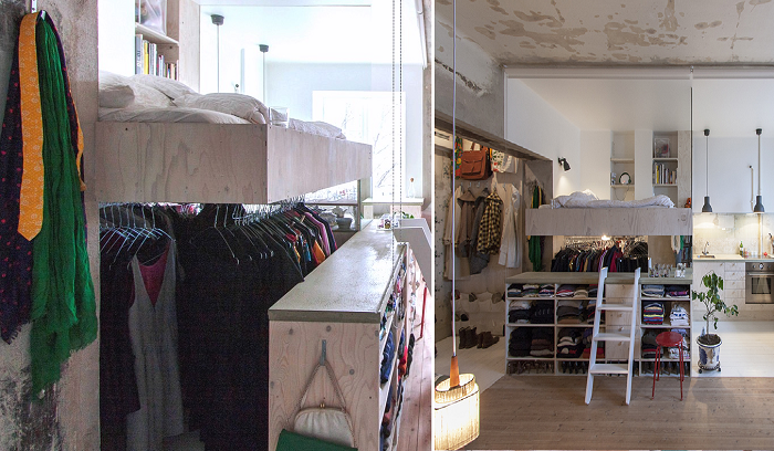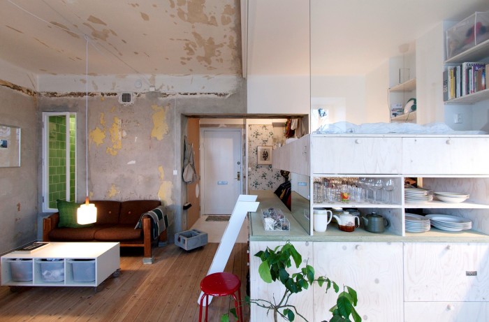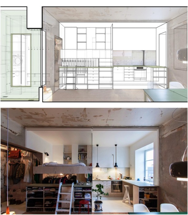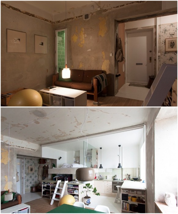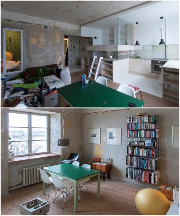 Решение жилищного вопроса толкает некоторых людей на неординарные эксперименты, особенно если такая недвижимость находится в крупных городах. Став «счастливым» обладателем заброшенной квартиры площадью всего лишь 36 м?, служившей многие годы складом, девушке пришлось полностью переосмысливать интерьер, чтобы превратить помещение в комфортабельное жилье с удивительным сочетанием прошлого и современного оформления. Карин Мац превратила заброшенный склад в комфортную квартиру с неординарным интерьером (Стокгольм, Швеция). | Фото: johbatesstudio.com/ karinmatz.se. В таком городе, как Стокгольм (Швеция), с огромной нехваткой жилья и ценой за 1 кв. метр приобрести недвижимость за небольшие деньги практически нереально. Если, конечно же, это не заброшенное помещение в плачевном состоянии. Так повезло молодой девушке-дизайнеру, которая решилась на столь рискованный эксперимент, но все неурядицы перевесила цена, объявленная на аукционе. Так выглядела квартира-склад во время аукциона (Стокгольм, Швеция). | Фото: karinmatz.se. Эта квартира много лет служила складом, а последние 20 лет и вовсе стояла заброшена. Судя по всему предыдущий владелец пытался сделать ремонт в 1980-х гг, но по какой-то причине он не состоялся, поэтому в помещении обои были наполовину сняты, на рабочей стене кухни осталось лишь несколько плиток и торчащий кран. Неприглядный вид полностью «убитой» квартиры не испугал девушку. | Фото: plataformaarquitectura.cl. В квартире не было даже электричества, да и коммуникации пришли в негодность, но это и понятно, ведь последние десятилетия здесь хозяйничали только крысы. Для начала Карин Мац составила план-чертеж квартиры (Стокгольм, Швеция). | Фото: karinmatz.se. Учитывая тот факт, что новой владелицей стала Карин Мац (Karin Matz), довольно креативный дизайнер и архитектор, ей не составило труда сделать новый план-чертеж со всеми изменениями, которые захотелось внедрить в свое крошечное жилище. Квартиру девушка условно разделила на две зоны. | Фото: karinmatz.se. Несмотря на то, что пространство было довольно ограничено, общая площадь квартиры составляла всего лишь 36 м? девушке хотелось оставить как можно больше свободного пространства, но при этом иметь комфортабельное жилье. Как оказалось, это возможно сделать, если максимально рационально использовать каждый сантиметр площади. Чтобы осуществить свою задумку в создании неординарного жилья, ей пришлось условно разделить квартиру на две части. Зона кухни до и после ремонта. | Фото: treehugger.com. В одной половине был сделан идеальный ремонт с проведением скрытых электрокоммуникаций, выравниванием стен, покраской оконной рамы, установкой оригинальных светильников и укладкой ламината. Девушка оставила лишь трубы и рабочий фартук в том виде, какой он был на протяжении последних 20 лет. Почему Карин так поступила, станет ясно тогда, когда узнаете, как она решила оформить вторую часть пространства. С помощью модульных систем из Ikea удалось создать кухню, спальню и гардеробную. | Фото: plataformaarquitectura.cl. Учитывая, что в этой зоне Карин планировала обустроить полноценную кухню, спальню и гардеробную, ей пришлось приобрести мебельные модули от Ikea, из которых собрали кухонный гарнитур. Спальню удалось оформить на втором ярусе, что значительно увеличило свободное пространство в крошечной квартире. | Фото: contemporist.com. А вот спальное место удалось 