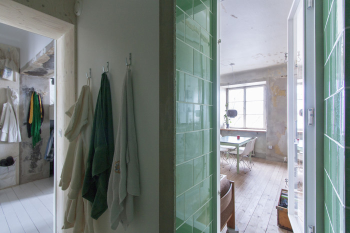 Учитывая, что ванная комната расположена посередине необычной квартиры, она стала своеобразным связующим звеном между «прошлым» и «настоящим».