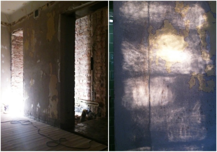 Эта квартира много лет служила складом, а последние 20 лет и вовсе стояла заброшена. Судя по всему предыдущий владелец пытался сделать ремонт в 1980-х гг, но по какой-то причине он не состоялся, поэтому в помещении обои были наполовину сняты, на рабочей стене кухни осталось лишь несколько плиток и торчащий кран.