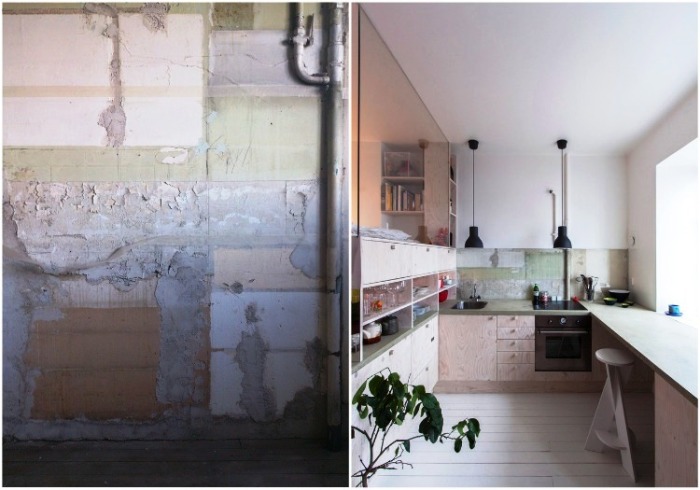 Зона кухни до и после ремонта. | Фото: treehugger.com.