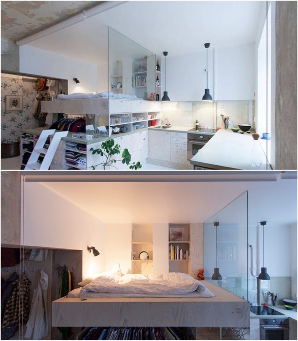 Спальню удалось оформить на втором ярусе, что значительно увеличило свободное пространство в крошечной квартире. | Фото: contemporist.com.