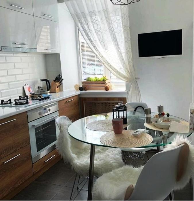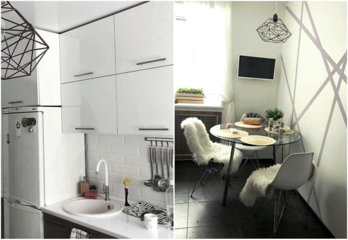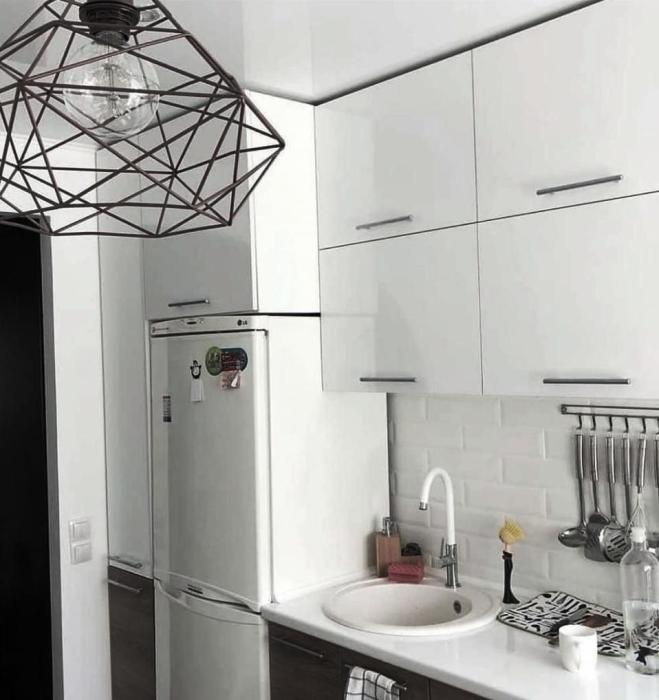 Белый цвет в тандеме с глянцевыми поверхностями помог визуально увеличить площадь миниатюрной кухни. | Фото: interesnoznat.com.
