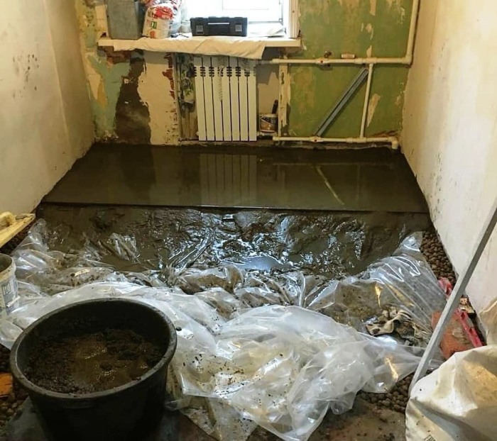 Чтобы защитить пол от губительного влияния влаги, нужно использовать гидроизоляционные материалы. | Фото: industriyaremonta.ru. Совет от авторов Novate.Ru: При выравнивании пола с использованием любых растворов нужно делать состав строго по рекомендациям производителя, следить за температурным режимом и поддержанием влажности в помещении, а также дождаться полного высыхания покрытия.