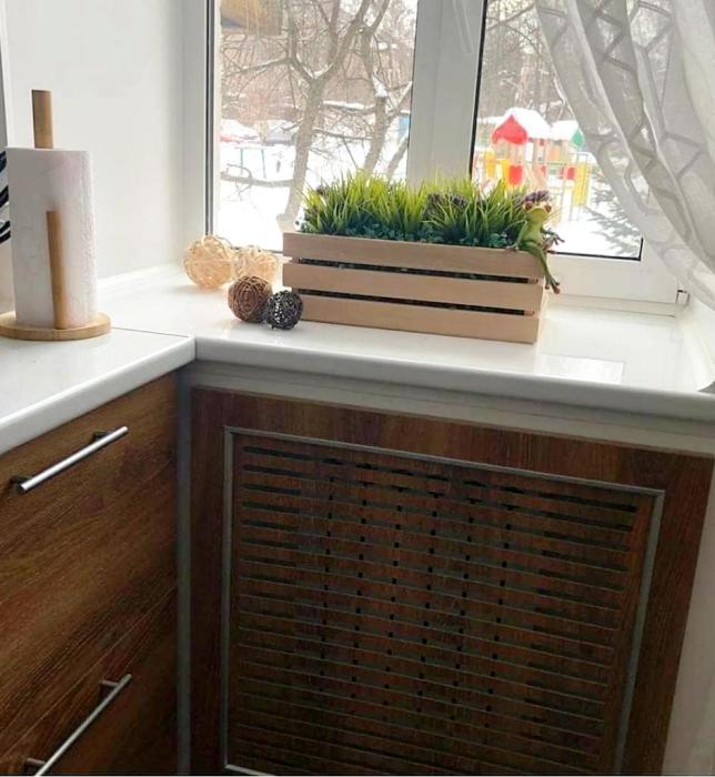 Радиатор спрятали за панелью такого же цвета, что и тумбы в рабочей зоне кухни. | Фото: lemurov.net.