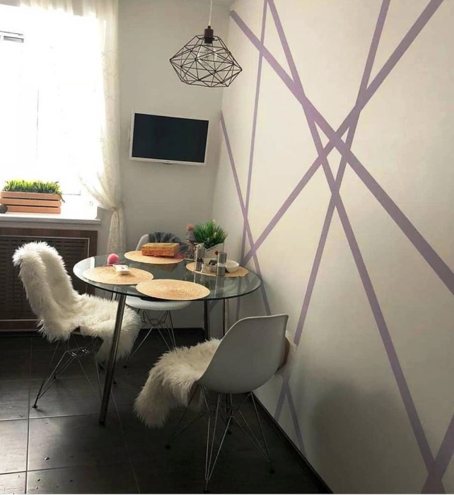 Благодаря этому одна стена осталась свободной, и возле нее получилось оформить обеденный уголок. Чтобы внести оригинальную нотку в оформление интерьера, на этой стене сделали несколько широких полос серого цвета.