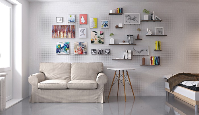 Если старые обои с розочками уже надоели, а на новые – денег пока не накопили, украсьте стены декоративными элементами. Это могут быть картины, постеры или семейные фотографии. Конечно, эти изменения не заставят вас полюбить обои, однако отношение к комнате в целом изменится. То же самое касается о громоздкой полки, которая уже давно висит на стене и портит внешний вид гостиной. Вместо того, чтобы снимать ее и оставлять следы от гвоздей, компенсируйте неудачное расположение симпатичным содержанием: можно поставить на нее коллекцию книг, которые вы привозите из-за границы, или заполнить фотографиями, ароматическими свечами, поделками ручной работы. Согласитесь, будет смотреться гораздо лучше, чем стопка какой-нибудь советской литературы.