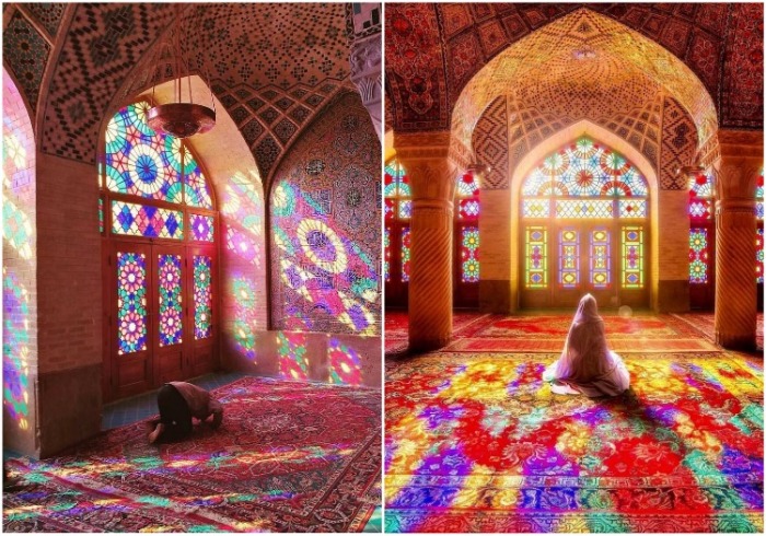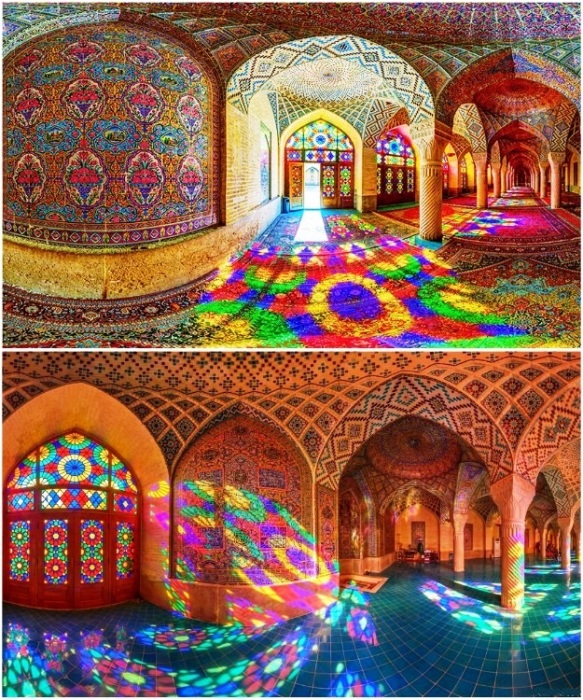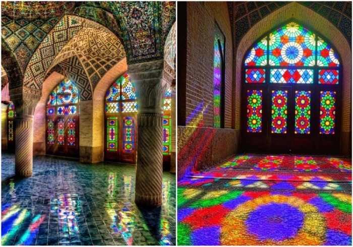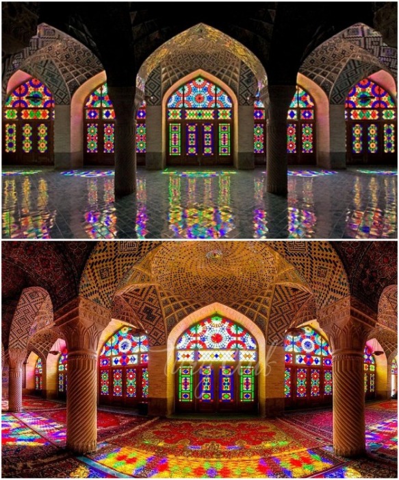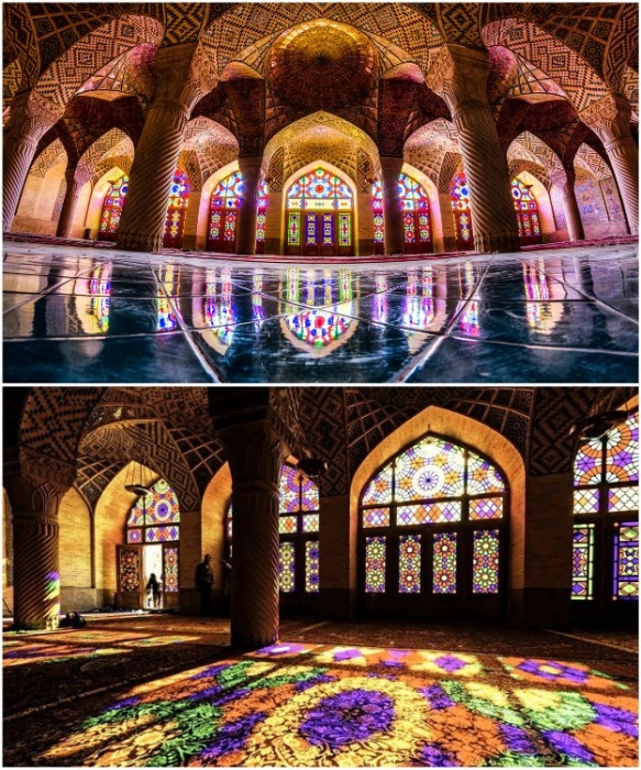Человечество за всю историю существования создало огромное количество культовых сооружений с неповторимым дизайном. Однако в Иране, в городе Шираз есть уникальная мечеть Насир-аль-Мульк, которая по праву считается самым удивительным творением рук человеческих, ведь завораживающую красоту ее витражей нельзя описать словами ее только нужно увидеть собственными глазами. Потрясающая иранская «Розовая мечеть» является яркой достопримечательностью общемирового значения (Nasir al-Mulk, Иран). | Фото: mazhab.kz. Расположенная в Ширазе (Иран) мечеть Насир-аль-Мульк (Nasir al-Mulk) считается самым необычным культовым сооружением мусульман. Святыня построена еще в XIX в. (1876 - 1888 гг.) по приказу одного из лордов династии Каджаров. Вход в «радужную мечеть» Насир-аль-Мульк украшен мозаикой и стихами из Корана (Шираз, Иран). | Фото: arrow.holiday. Интересно: Это уникальное строение было спроектировано Мухаммадом Хасан-е-Мемар (Muhammad Hasan-e-Memar) и Мухаммедом Реза Каши Паз-и-Ширази (Muhammad Reza Kashi Paz-e-Shirazi), которые в качестве главного украшения использовали несвойственные для архитектуры мечети витражи. Когда солнечные лучи проходят сквозь витражи, внутри мечети появляются фантастически яркие переливы (Nasir al-Mulk, Иран). | Фото: photokarachko.blogspot.com. Единственную в своем роде мечеть украшают витражи с изображением огромного количества роз, которые стали главным узором, изображенным как на внутренних элементах культового сооружения, так и на внешних. Именно это обстоятельство довольно ярко выбивается из общепринятых правил и канонов в оформлении мусульманских святынь и делает ее неповторимой. Такое обилие роз очень просто объясняется – Шираз в прямом смысле слова утопает в розах и на его территории можно встретить более 300 видов этого прекрасного цветка. Жемчужная арка стала украшением северного входа на территорию мечети-музея (Nasir al-Mulk, Иран). | Фото: ru.wikipedia.org. Колонны и арка нефа украшены разноцветной мозаикой (Nasir al-Mulk, Иран). | Фото: bazariran.ru. Nasir al-Mulk - довольно большая мечеть, площадь внутреннего пространства составляет практически 2,9 тыс. м?, не говоря о том, что у нее есть еще внутренний дворик и обширная дворовая территория. Особое восхищение вызывает Жемчужная арка, которая находится на северной стороне двора. Ее своды расписаны геометрическими фигурами, прекрасными розами и стихами из Корана. На восточной стороне находится неф, созданный с помощью 7 каменных колонн, а вот с южной расположены 2 минарета. Невероятная игра цвета и света наступает с восходом солнца (Nasir al-Mulk, Иран). | Фото: sanaei.livejournal.com. Западную часть ансамбля занимает основной зал мечети, который благодаря потрясающей красоте витражей вызывает неописуемые чувства, особенно если находиться в нем в солнечный день. Когда человек впервые попадает в основной зал мечети, он ощущает себя внутри настоящего калейдоскопа, причем в прямом смысле этого слова. Nasir al-Mulk, Иран. | Фото: iranasia.com. И это немудрено, несколько огромных витражных окон, расписанных в разном стиле и невероятно яркими красками, пропуская солнечные лучи, превращают огромный зал в фантастической красоты дворец, хотя роскоши в нем абсолютно никакой нет. Этому поспособствовала хитрость, которую применили художники во время росписи. Витражи расписаны в особом стиле, поэтому возникает иллюзия объемного цветовосприятия (Nasir al-Mulk, Иран). | Фото: picbear.org. Мало того, что ка