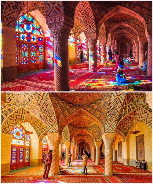 Когда солнечные лучи проходят сквозь витражи, внутри мечети появляются фантастически яркие переливы (Nasir al-Mulk, Иран). | Фото: photokarachko.blogspot.com.