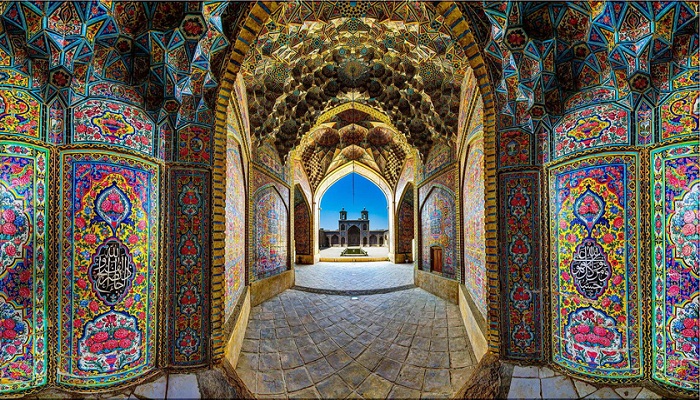 Вход в «радужную мечеть» Насир-аль-Мульк украшен мозаикой и стихами из Корана (Шираз, Иран). | Фото: arrow.holiday. Интересно: Это уникальное строение было спроектировано Мухаммадом Хасан-е-Мемар (Muhammad Hasan-e-Memar) и Мухаммедом Реза Каши Паз-и-Ширази (Muhammad Reza Kashi Paz-e-Shirazi), которые в качестве главного украшения использовали несвойственные для архитектуры мечети витражи.