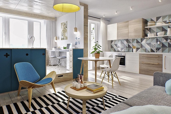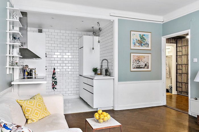 Обои в западных квартирах – явление достаточно редкое. Особенно, если речь идет о крохотных квартирах. Этот элемент играет скорее роль декора, в то время, как в качестве основной отделки выступает краска. Как правило, стены выкрашивают в белый, молочный, реже бежевый цвет. Тем не менее, когда заходишь в такую квартиру, не возникает ощущение, что ты оказался в больничной палате. Европейцы очень умело играют с декором. Они прекрасно понимают, что чисто белый интерьер выглядит скучно и безлико. Именно поэтому хозяева квартиры украшают комнаты яркими аксессуарами, постерами, уютными вещицами и красивой мебелью. Как мы уже упоминали, на Западе отказываются от перегородок, а значит у них существует единое пространство, которое всегда оформляется в общем стиле. Такой нехитрый дизайнерский прием позволяет сделать квартиру максимально уютной и гармоничной. Для оформления интерьера старайтесь подбирать максимально простой дизайн без нагромождения различных элементов. Это может быть кантри, минимализм или скандинавский стиль.