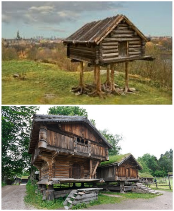 В Норвегии тоже можно встретить строения на курьих ножках, но здесь на сваи пристраивали амбары, где хранили продукты. Как оказалось, это очень практичная конструкция, которая: предохраняет от влажности, обеспечивает вентиляцию пространства под днищем, позволяет заменить испортившуюся от времени деревянную основу без ущерба для домика, спасает съестные запасы от грызунов и диких зверей, которых в той местности более чем достаточно.