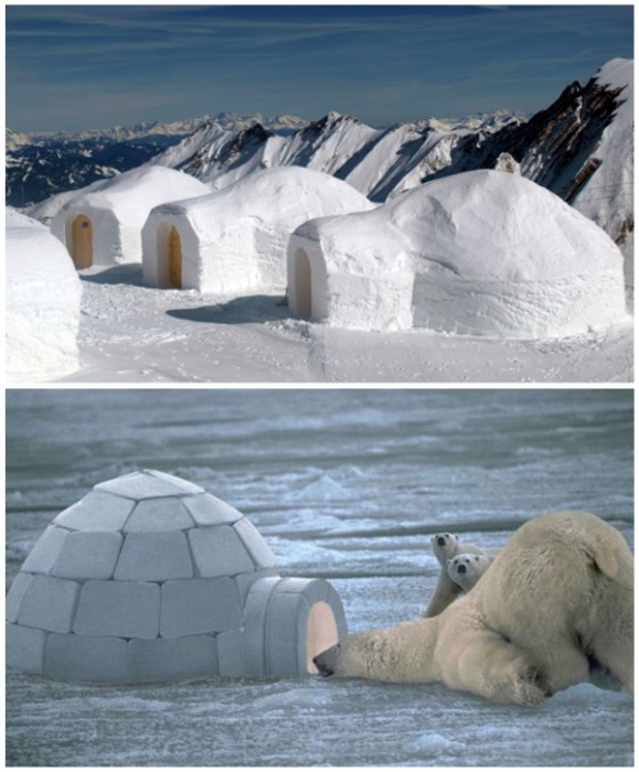 А вот иглу кардинально отличаются от сборно-разборных домов, потому что они создаются в больших сугробах из плотного снега или сложены из ледяных блоков. Это традиционное жилище эскимосов, которые живут в самых суровых климатических условиях на Земле. Именно такое строение является надежным укрытием от сильных морозов, снежных бурь и белых медведей.