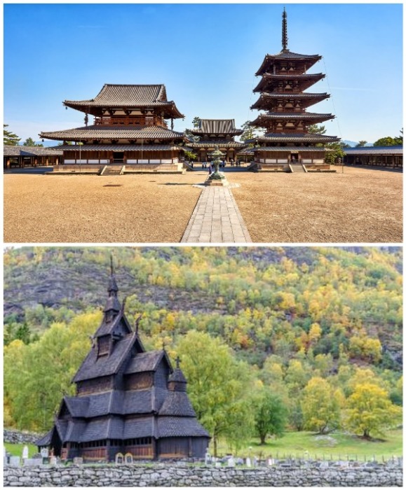 Старинный буддийский храм Хорю-дзи в Японии и самая древняя деревянная церковь Норвегии. | Фото: voyagejapan.com/ 123RF.com.