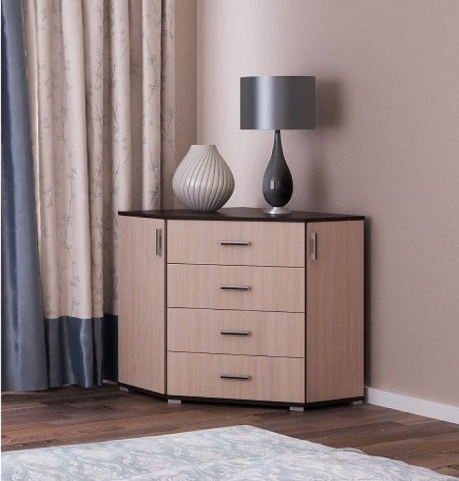 Если комната остро нуждается в дополнительных местах для хранения, вы вполне можете заполнить угол небольшим комодом. Для того, чтобы он играл не только практичную, но и эстетическую роль, подбирайте вариант с оригинальным дизайном. Либо, если спальня оформлена в нейтральных оттенках, купите яркий комод, который идеально впишется в имеющуюся обстановку и станет акцентом в интерьере.