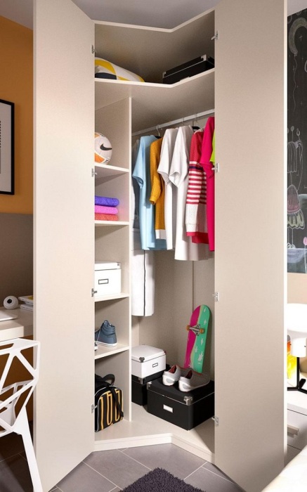 Обычно, массивные и громоздкие шкафы занимают большую часть комнаты, не давая развернуться. Что делать в этом случае? Заменить шкаф на компактную угловую гардеробную. В ее обустройстве нет ничего сложного. Просто повесьте в углу штангу и располагайте там плечики с вещами. Также можно организовать там несколько полочек. Если вы не хотите, чтобы одежда находилась на виду, сделайте гардеробную на заказ с учетом размеров вашей комнаты. Тогда вы станете обладателем компактного, но функционального места для хранения одежды.