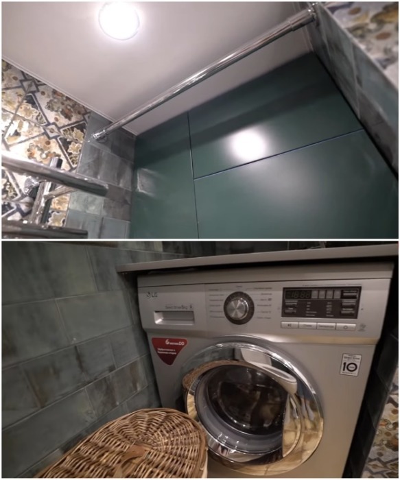 В ванной комнате сделали нишу, в которой поместилась стиральная машина и шкаф. | Фото: youtube.com/ INMYROOM TV.