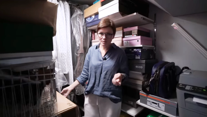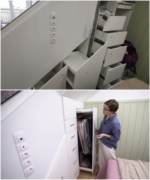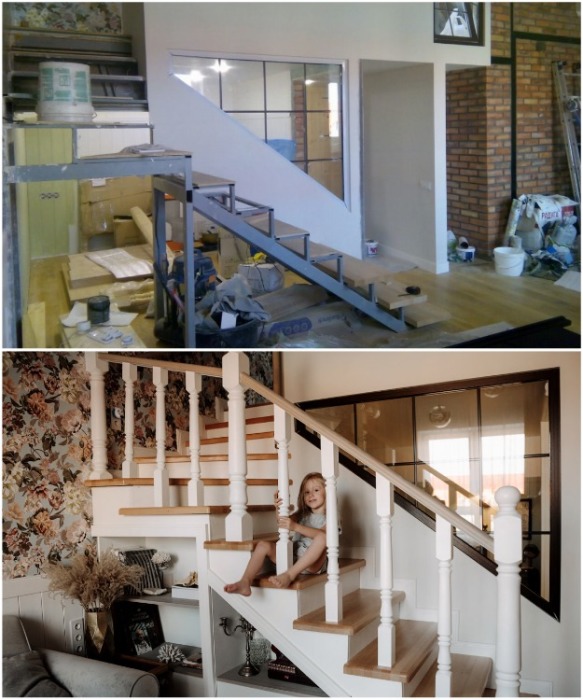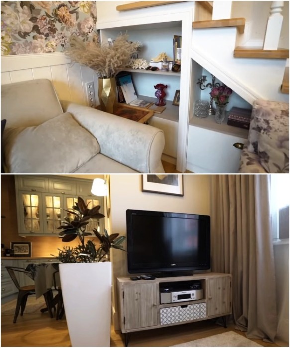 Встроенные системы хранения под лестницей сделаны по расчетам Ольги. | Фото: youtube.com/ INMYROOM TV.