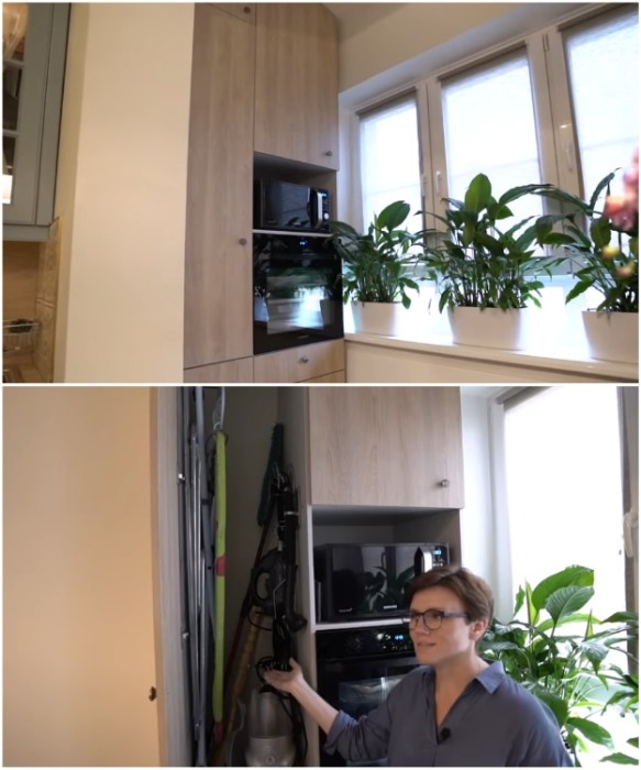 На лоджии установили вместительный шкаф, что позволило пристроить бытовую технику, нужные в хозяйстве вещи и продукты питания. | Фото: youtube.com/ INMYROOM TV.