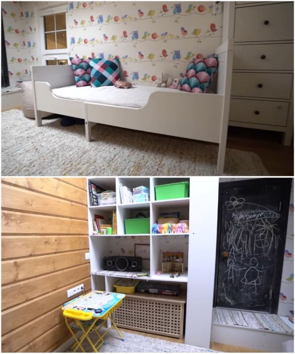 На втором этаже получилось организовать полноценную детскую комнату, где поместились кровать-трансформер, комод для белья, стеллаж с игрушками и книжками, который при надобности превратится в полноценное рабочее место. В этой комнате есть один очень интересный секрет, за дверью покрытой грифельной краской находится настоящий чулан, где хранятся сезонные вещи, обувь, дополнительные стулья, ксерокс и различные мелочи.