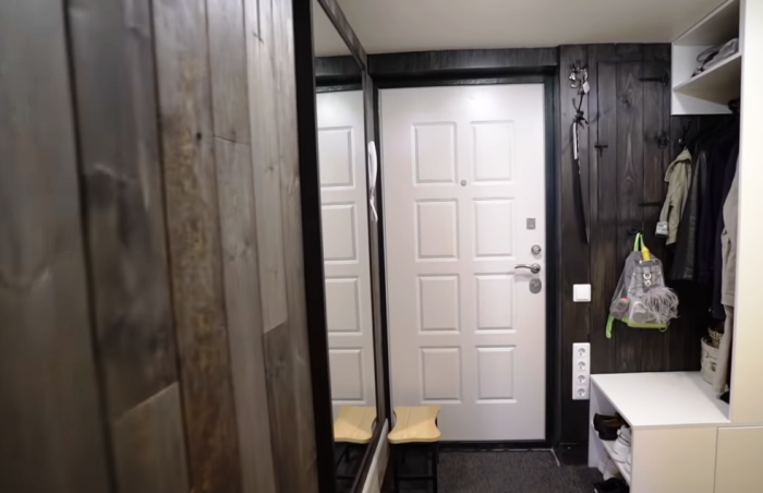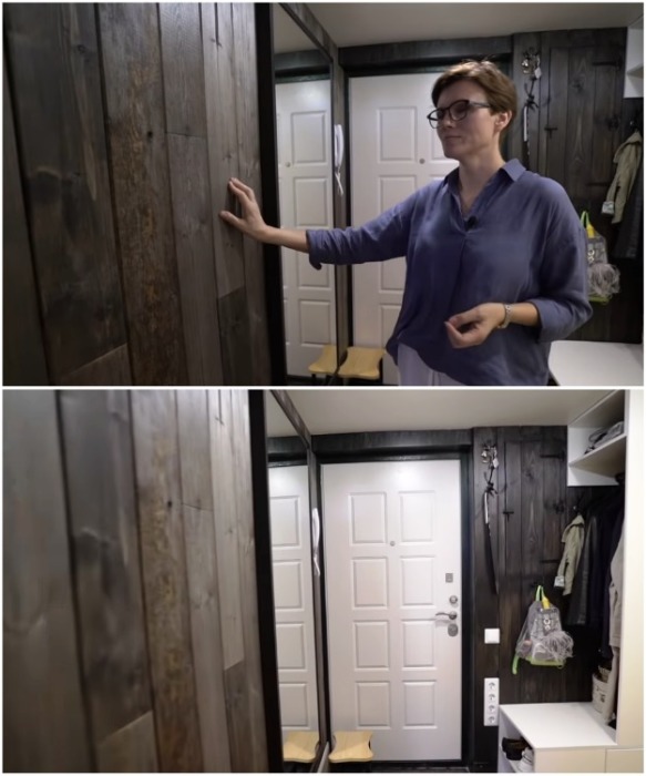 Стены прихожей обшили древесиной со стороны, где больше всего пачкается и затирается. | Фото: youtube.com/ INMYROOM TV.