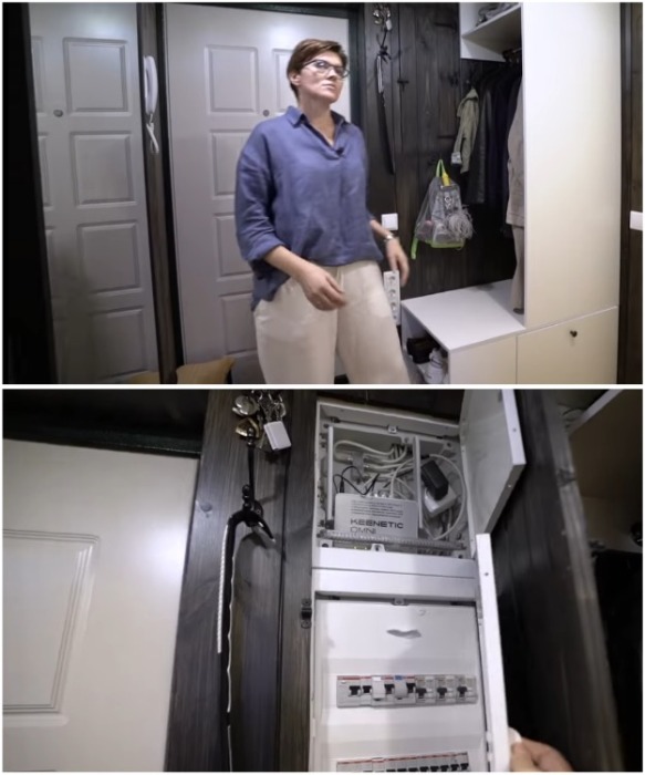 Многофункциональная мебель в прихожей и потайной шкафчик помогли спрятать нужные вещи и приборы. | Фото: youtube.com/ INMYROOM TV.