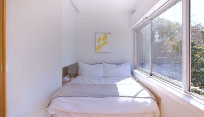 В квартире получилось оформить спальню у окна («Boneca», Сидней). | Фото: youtube.com/ NEVER TOO SMALL.