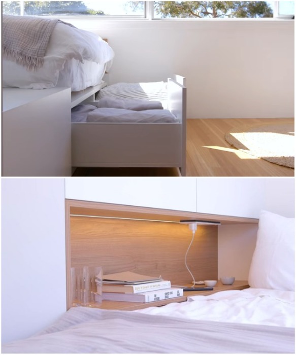 Подиум стал основой для спального места и вместительной системой хранения («Boneca», Сидней). | Фото: youtube.com/ NEVER TOO SMALL.