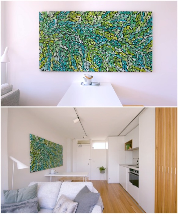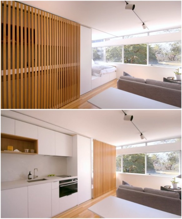 Но это еще не все хитрости и новшества. Для того чтобы спрятать кухню или спальню достаточно будет передвинуть перегородку сделанную из деревянных реек с небольшим расстоянием друг от друга, чтобы конструкция выглядела более изящно. Интересный факт от Novate.Ru: Дизайн этой крошечной квартиры в 2018 г. был удостоен нескольких профессиональных наград в Австралии, в том числе награжден Премией за лучший дизайн интерьера 2018.