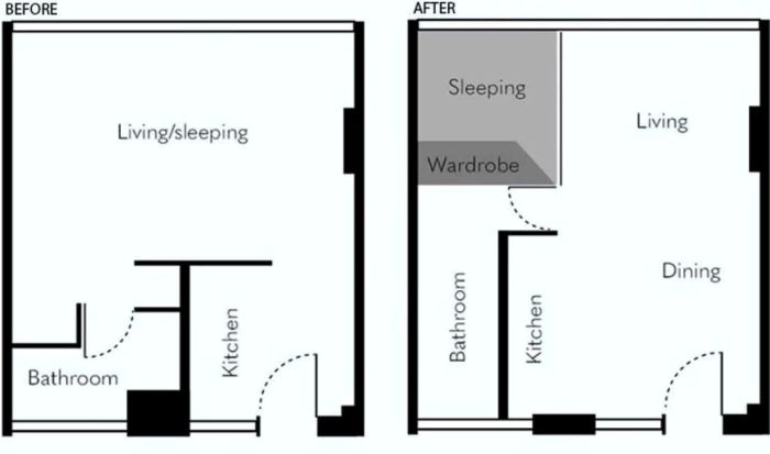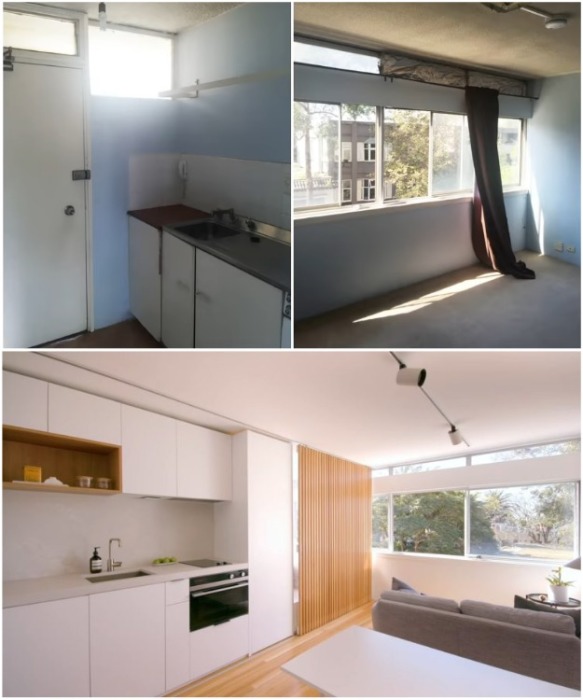 Учитывая современные реалии жизни и активное уменьшение квадратных метров для организации жилья, владельцы и креативные дизайнеры находят интересные варианты обустройства даже мини-апартаментов. Сложно даже представить, как можно реорганизовать пространство площадью всего лишь 24 м?, но австралийскому архитектору удалось создать стильную и комфортную квартиру, в которой нашлось место для гостиной, кухни, спальни, гардеробной и полноценной ванной комнаты. Австралийский архитектор смог превратить квартиру 24 кв.м. в современное, стильное и комфортное жилье (Brad Swartz, Сидней). | Фото: youtube.com/ NEVER TOO SMALL. Даже самое миниатюрное жилье, если оно свое, это уже большой плюс, ну а при грамотном распределении площади можно создать еще и комфортную жизнь. Именно по этому пути и пошел архитектор из Сиднея (Австралия) Брэд Шварц (Brad Swartz). В таком виде была жилая зона и кухня во время покупки квартиры. | Фото: youtube.com/ NEVER TOO SMALL. Когда подвернулась возможность купить квартиру в городе, где он работал в одном в дизайнерском бюро, молодого человека не смутили ни крошечные габариты, ни бестолковая планировка, ни запущенный вид жилья. Запущенный вид и непрактичная планировка квартиры до преобразования. | Фото: youtube.com/ NEVER TOO SMALL. С его профессиональными навыками грамотно распределить пространство и сделать новый проект совсем не составляло никакого труда. Кстати сказать, свои мини-апартаменты Брэд назвал Boneca (с португальского – кукольный дом). Планировка застройщика и новый проект Брэда («Boneca», Сидней). | Фото: archidea.com.ua. Непродуманную застройщиками планировку он решил полностью поменять. Для начала пришлось снести совсем неудачную перегородку, которая служила стеной в ванной комнате и построить новую в нужном месте. Благодаря одной правильно расположенной стене удалось выделить сразу несколько зон, причем крошечными они совсем не смотрелись. С одной стороны ванной комнаты установили душевую кабину, унитаз и рукомойник («Boneca», Сидней). | Фото: archidea.com.ua. С другой стороны ванной комнаты обустроили гардеробную, которая скрывается за дверкою шкафа («Boneca», Сидней). | Фото: youtube.com/ NEVER TOO SMALL. В итоге в реорганизованной ванной комнате поместился унитаз, шикарная душевая кабинка, рукомойник и вместительный шкаф-гардеробная, куда поместились все вещи владельца. Поскольку ванная стала узкой и длинной, добавилось место для оформления кухонной зоны. Кухонный гарнитур продуман до мелочей и заменяет полноценную кухню («Boneca», Сидней). | Фото: youtube.com/ NEVER TOO SMALL. Конечно же, полноценной кухней ее сложно назвать, ведь по сути это большой кухонный гарнитур с рабочей столешницей, варочной поверхностью, мойкой и вытяжкой. В гарнитуре удалось поместить не только все необходимое для приготовления пищи, хранения продуктов и столовых приборов с кухонной утварью, но и небольшой холодильник. Гостиная-столовая в обновленной квартире («Boneca», Сидней). | Фото: youtube.com/ NEVER TOO SMALL. Учитывая компактное расположение ванной и кухни, для организации столовой-гостиной и спальни осталось достаточно места, чтобы квартира выглядела даже просторной. Большую часть площади Брэд выделил для гостиной и столовой, а вот спальне досталась дальняя часть комнаты, которая примыкает к ванной комнате и кухне. В квартире получилось оформить спальню у окна («Boneca», Сидней). | Фото: youtube.com/ NEVER TOO SMALL. Благодаря образованной