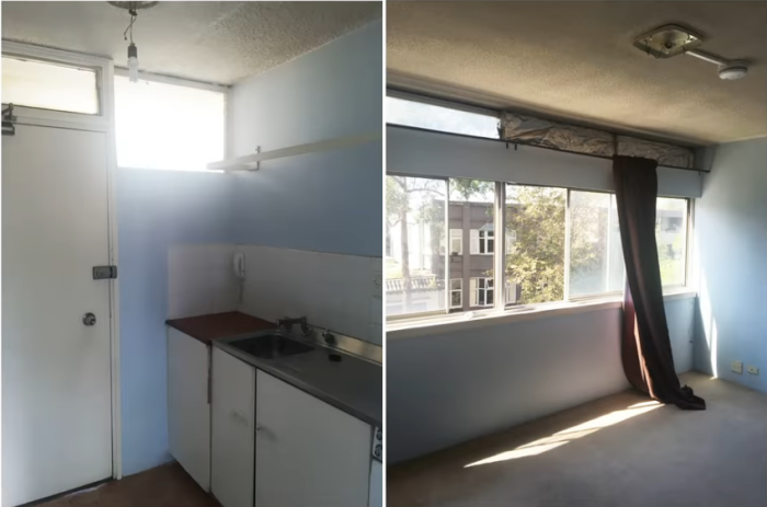В таком виде была жилая зона и кухня во время покупки квартиры. | Фото: youtube.com/ NEVER TOO SMALL.