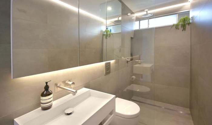 С одной стороны ванной комнаты установили душевую кабину, унитаз и рукомойник («Boneca», Сидней). | Фото: archidea.com.ua.