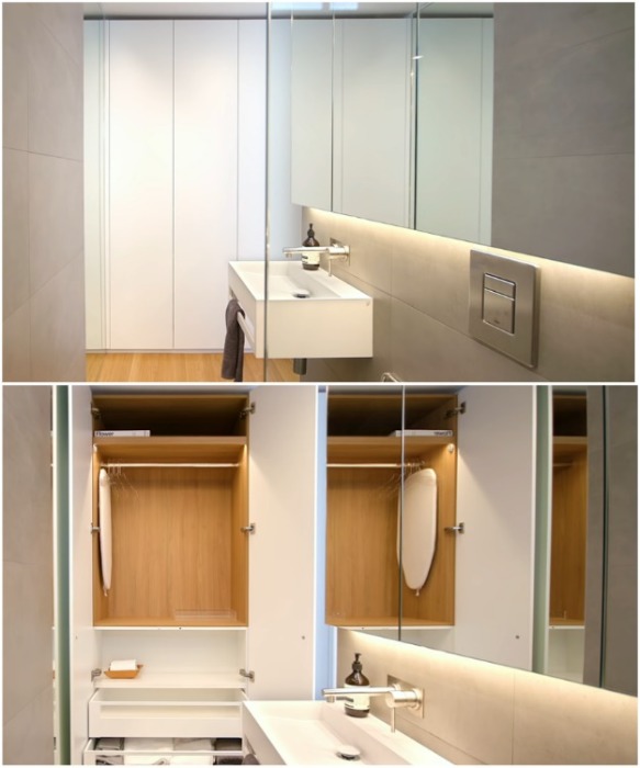 С другой стороны ванной комнаты обустроили гардеробную, которая скрывается за дверкою шкафа («Boneca», Сидней). | Фото: youtube.com/ NEVER TOO SMALL.