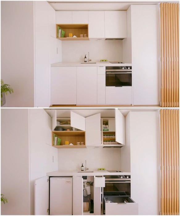 Кухонный гарнитур продуман до мелочей и заменяет полноценную кухню («Boneca», Сидней). | Фото: youtube.com/ NEVER TOO SMALL.