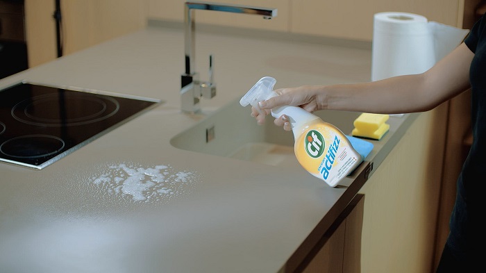 Также стоит обратить внимание на то, что, когда моете плиту и духовой шкаф при помощи разнообразных средств для удаления жира, старайтесь быть предельно внимательными. От них на столешнице остаются некрасивые белесые пятна, даже если вы всего на пару минут поставите бутылку с подтекшим средством на поверхность. Также может образоваться непрезентабельный ободок, который будет достаточно нелегко устранить, если он подсохнет.