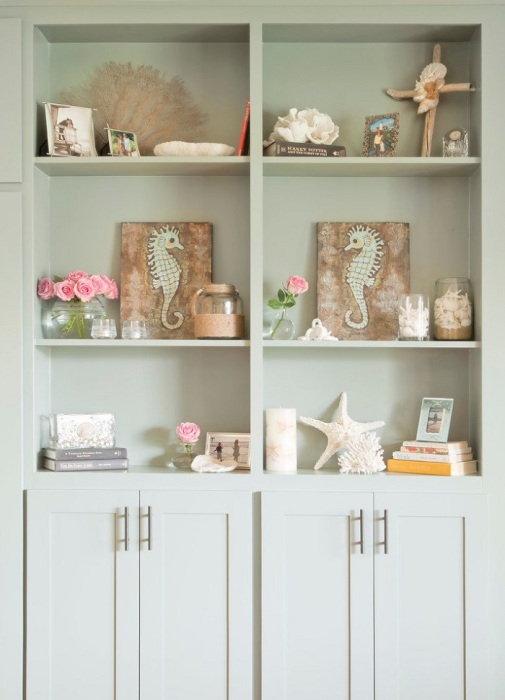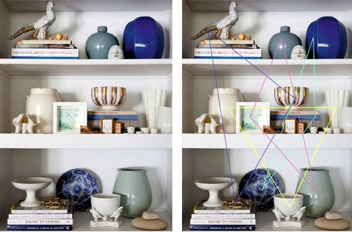 Существует один интересный композиционный прием, который называется «Правило треугольника». Чаще всего его используют в фотоискусстве, однако и при расстановке предметов на открытых полках он будут достаточно полезным и эффективным. Расставляйте предметы таким образом, чтобы они были вершинами треугольника, если вы визуально нарисуете эту геометрическую фигуру. Треугольники могут иметь различные цвета, размеры и фактуры, зрительно пересекаться друг с другом.