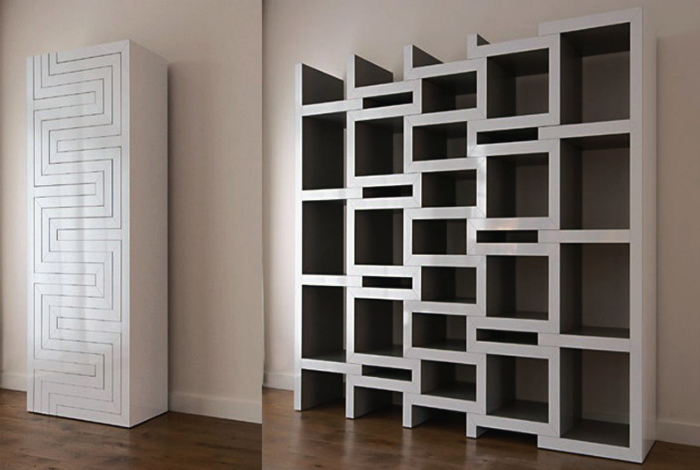 Оригинальный стеллаж. | Фото: HomeMajestic. Оригинальный стеллаж, размер и дизайн которого может определять сам владелец. В сложенном виде, стеллаж выглядит, как лаконичный узкий пенал , который легко поместится в углу небольшой комнаты.