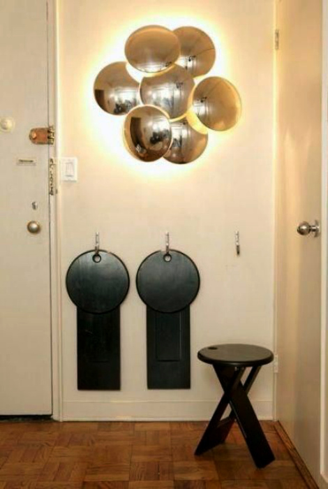 Стильные складные табуреты. | Фото: Pinterest. Несколько стильных табуретов, которые в сложенном виде становятся почти плоскими и могут быть подвешены на крючки - прекрасное решение для экономии места на маленькой кухне или в прихожей.