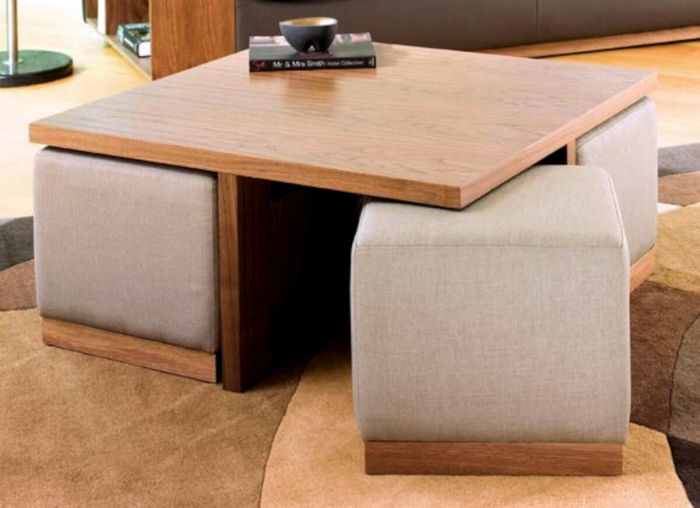 Комплект эргономичной мебели. | Фото: Cypress. Стильный и лаконичный комплект мебели, который состоит из низкого журнального столика и 4 мягких пуфиков, спрятанных под ним. По мнению Novate.ru, такой комплект мебели здорово впишется в интерьер маленькой гостиной и позволит избежать покупки дополнительных кресел и диванов.