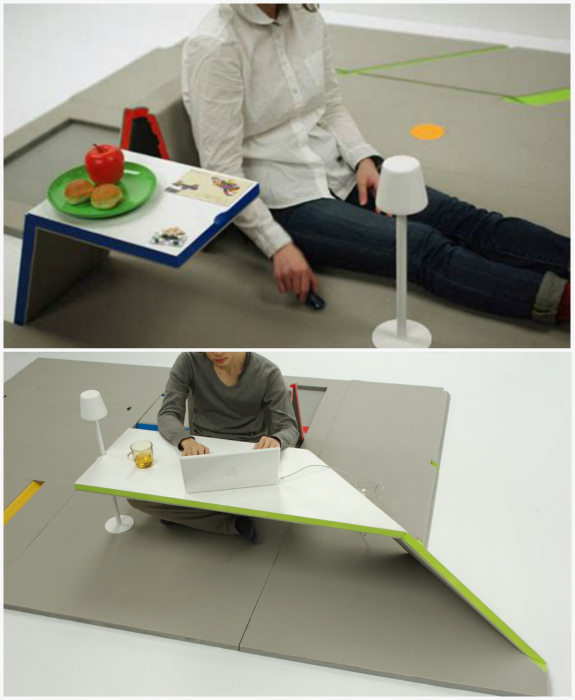 Коврик, способный выполнят множество функций.| Фото: assz.ru. Уникальный коврик с гибкими прорезными деталями, которые можно поднимать и выстраивать по своему усмотрению. Данное изделие, как конструктор Lego, позволит за две минуты получить стол, тумбу или посадочное место нужного размера и именно в том месте, где вы хотите.