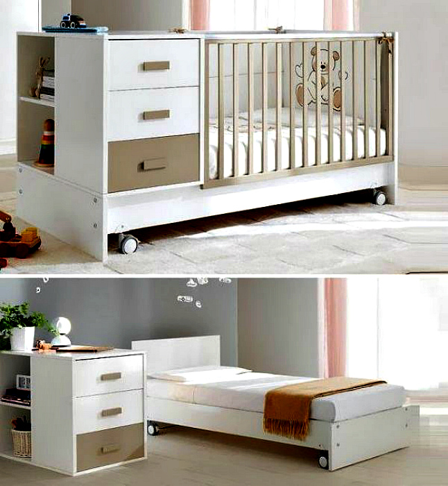 Комплект детской трансформирующейся мебели. | Фото: Pinterest – Пинтерест. Кроватка, которая растет вместе с ребенком - разумное приобретение молодых родителей. Сначала кроватка выглядит, как колыбель с удобными боковыми шкафчиками, а когда ребенок подрастает, шкафчики отделяются, увеличивая размер спального места.