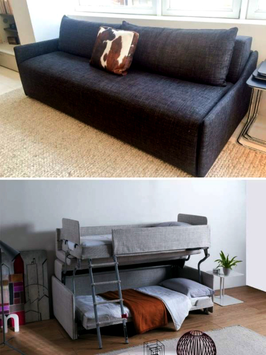 Трансформирующийся диван. | Фото: stroysam-karpinsk.ru. Лаконичный диван, который, как по щелчку превращается в небольшую двухъярусную кровать. По мнению Novate.ru, такой предмет мебели отлично впишется в интерьер малогабаритки и позволит обзавестись парочкой дополнительных спальных мест.
