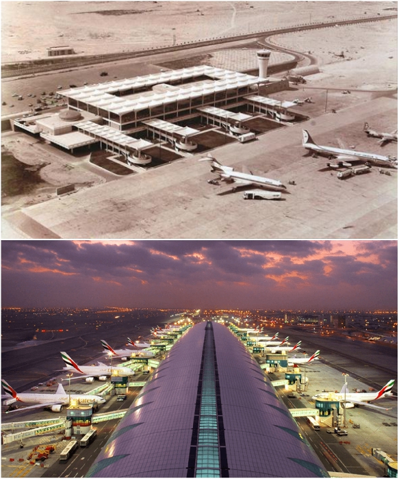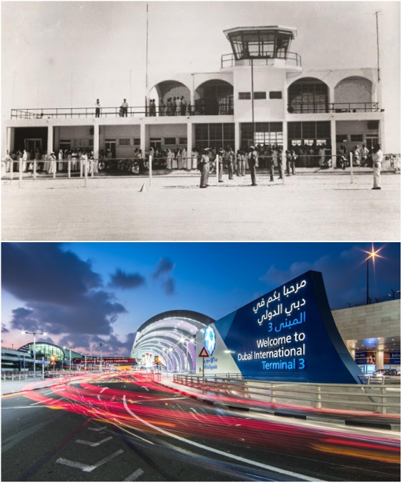 Международный аэропорт Дубаи в 1971 г. и один из его терминалов в 2019 г. | Фото: foto-history.livejournal.com/ viaggiareadubai.it.