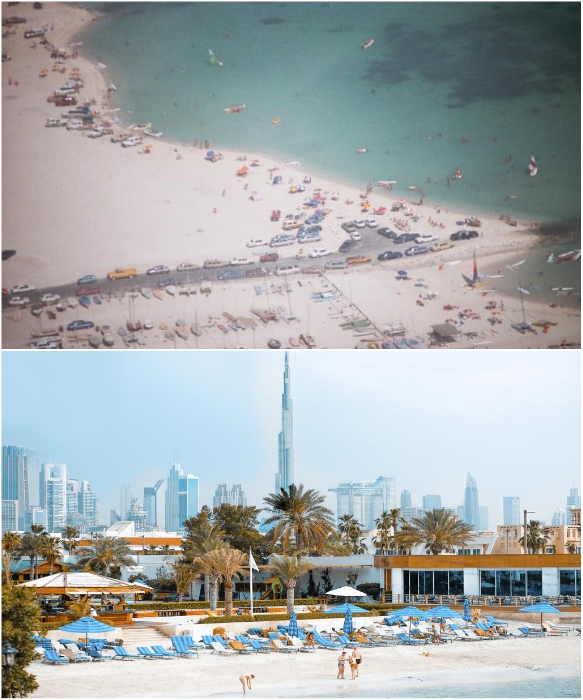 Пляж начала 90-х прошлого века и современные зоны отдыха Дубаи. | Фото: chatru.com/ tonkosti.ru.