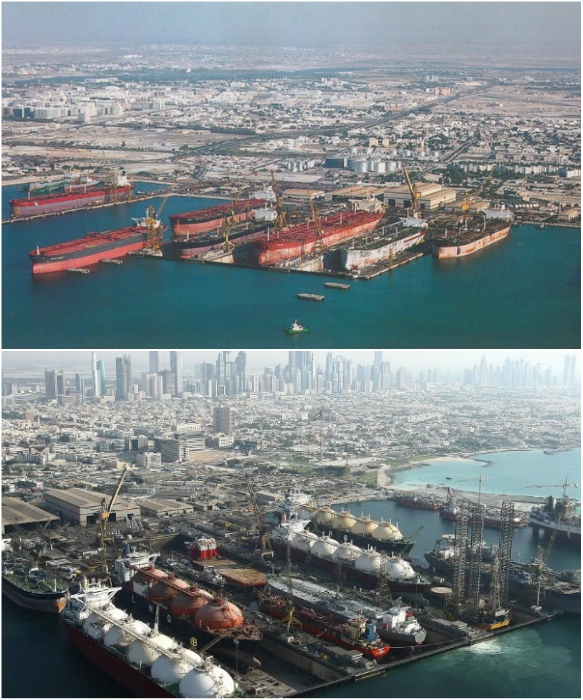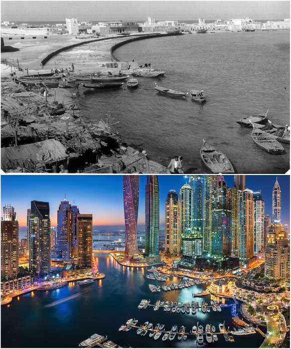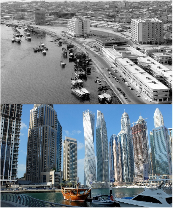 Набережная Дубаи в середине прошлого века и сейчас. | Фото: kartam47.livejournal.com/ tury.ru.