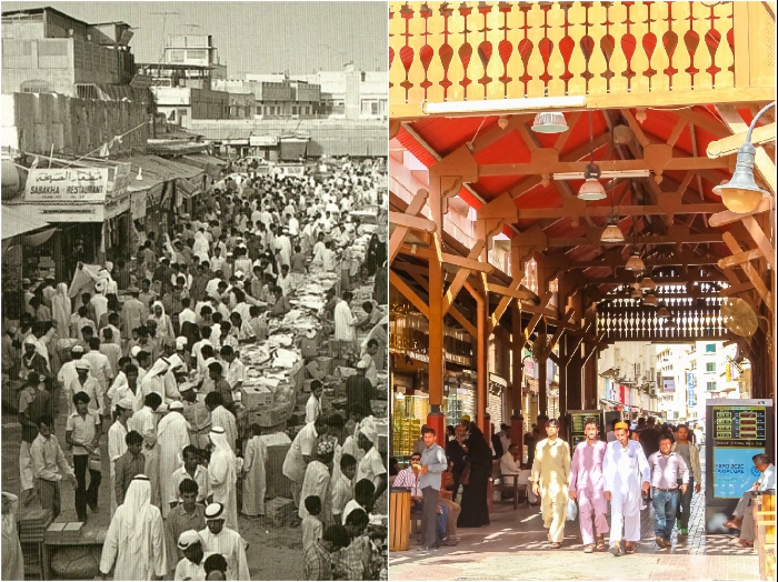 Одна из рыночных площадей Дубаи в 1950-е гг. и Рынок золота в 2018 г. | Фото: ismail-shan.ucoz.com/ meghashop.com.