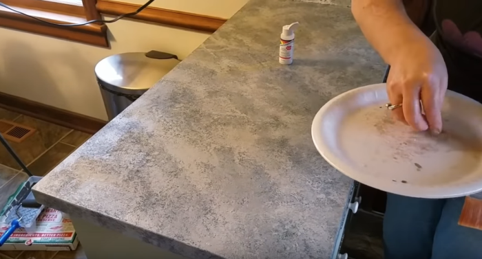 После монтажных работ нужно идеально вымыть рабочие поверхности и зашпаклевать все проблемные места. После высыхания состава зашкурить столешницы и еще раз хорошенько обезжирить. Теперь можно приступать к нанесению грунтовочной краски. Чтобы поверхность получилась более однородной, наносить грунтовку желательно в два слоя. После этого столешницы нужно тщательно покрасить базовым цветом, на котором и будет создаваться рисунок «гранита».