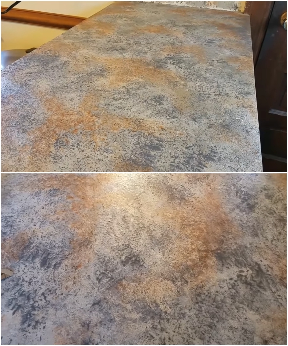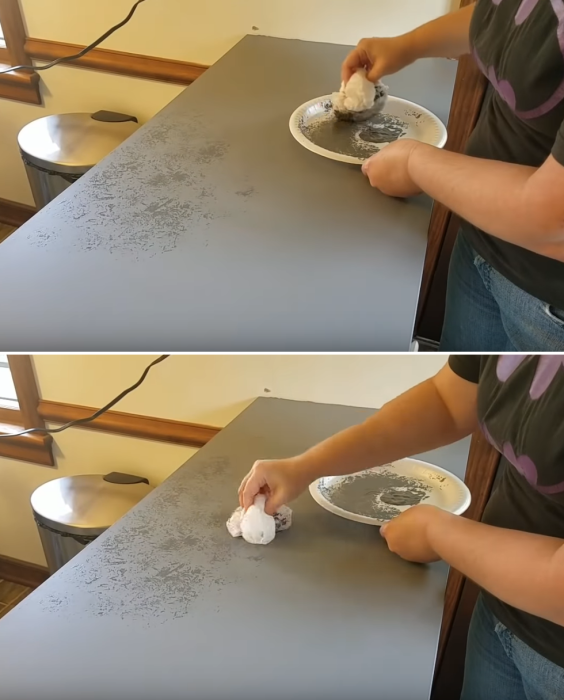 Для того чтобы получился глубокий «природный» тон, необходимо свернуть мягкий полиэтиленовый пакет (лучше подойдет майка) в рыхлый шарик, аккуратно опустить в краску самого темного тона, убрать лишний материал и в случайном порядке нанести на поверхность столешницы. Перед нанесением более светлого тона предыдущему слою краски нужно дать время хорошенько высохнуть, чтобы не сорвать материал.
