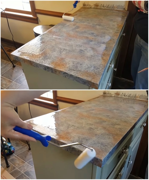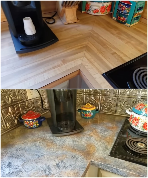 Поскольку каждый человек большую часть времени находится на кухне, то именно ее хочется привести в порядок в первую очередь. Особенно это касается рабочей поверхности, которая ежедневно подвергается негативному воздействию воды и моющих средств. Замена мебели – это довольно затратное мероприятие, поэтому стоит обратить внимание на кардинальное преобразование с минимальными вложениями, как это сделала креативная хозяйка. Старый кухонный гарнитур из натурального дерева решили сделать более современным. | Фото: youtube.com/ Lisa Capen Quilts. Даже если не экономить на покупке кухонного гарнитура, со временем он все равно теряет свою привлекательность. Особенно это касается столешницы, сделанной из натурального дерева, ведь постоянный контакт с агрессивными моющими средствами и влагой пагубно влияет на материал. И если это происходит, рабочая поверхность приобретает совсем неэстетичный вид и становится настоящим рассадником микробов и бактерий. Если планируете поменять мойку, то это нужно сделать до покраски. | Фото: youtube.com/ Lisa Capen Quilts. В такую ситуацию попала креативная хозяйка, которая решилась на эксперимент. Чтобы не менять добротную деревянную мебель и не покупать новую поверхность (притом не одну!), было решено кардинально изменить внешний облик гарнитура с помощью акриловой краски, полиэтиленового пакета и еще нескольких дополнительных материалов. Перед преобразованием столешниц были окрашены фасады тумб в белый цвет. Естественно, в некоторых аспектах женщине нужна была помощь, но в основном с такой творческой работой может справиться каждый. После того, как определились с цветом будущей столешницы, нужно купить краску нужных тонов. | Фото: youtube.com/ Lisa Capen Quilts. Перед началом работ стоит приобрести необходимые материалы и инструменты и только тогда приступать к подготовительным мероприятиям. Если нужно поменять мойку или любое другое оборудование, то это лучше сделать заранее, тем более что вокруг таких мест появляются самые поврежденные участки. Перед установкой новой мойки все проблемные места желательно тщательно обработать. Все повреждения необходимо зашпаклевать специальной замазкой для дерева, а после высыхания отшлифовать. | Фото: youtube.com/ Lisa Capen Quilts. После монтажных работ нужно идеально вымыть рабочие поверхности и зашпаклевать все проблемные места. После высыхания состава зашкурить столешницы и еще раз хорошенько обезжирить. Теперь можно приступать к нанесению грунтовочной краски. Чтобы поверхность получилась более однородной, наносить грунтовку желательно в два слоя. После этого столешницы нужно тщательно покрасить базовым цветом, на котором и будет создаваться рисунок «гранита». Важно: Каждый слой должен хорошенько просохнуть. Грунтовка и базовая краска наносятся плотным слоем. | Фото: youtube.com/ Lisa Capen Quilts. Поскольку хозяйке захотелось получить «гранитную» столешницу, заранее приобрела сразу несколько разных тонов серого цвета и коричневый пигмент, а для того, чтобы получить рыжеватые вкрапления – клей, слюду разных тонов. Для создания водонепроницаемой пленки и глянцевого покрытия понадобятся: полиуретановое покрытие и лак. Такой вид имеют столешницы перед нанесением рисунка. | Фото: youtube.com/ Lisa Capen Quilts. Совет от авторов Novate.Ru: Если таким творчеством решил заняться дилетант, то перед началом покраски лучше поис